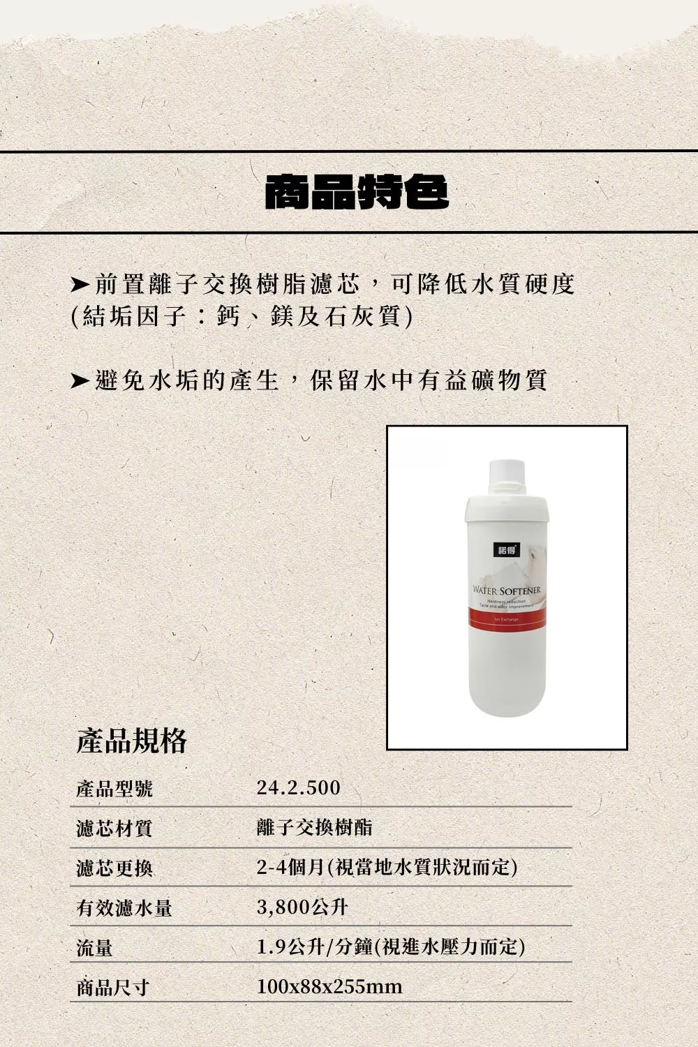 【諾得】軟水離子交換樹脂濾心24.2.500NT$900 ➤前置離子交換樹脂濾芯,可降低水質硬度(結垢因子:鈣、鎂及石灰質) 避免水垢的產生,保留水中有益礦物質,避免茶垢過多 【諾得】軟水離子交換樹脂濾心24.2.500 數量 加入購物車 貨號: 諾得R_24.2.500 分類: NEXWATER | 諾得, 各品牌濾心/濾材 標籤: 諾得 描述 相關商品 20吋活性碳濾芯 CTO 查看內容 20吋1微米濾芯 查看內容 【濱特爾 PENTAIR】MC² / MC2商用濾心 濾芯 美國進口平行輸入 EVERPURE (DIY) NT$2,600 加入購物車 1500G-RO膜 查看內容