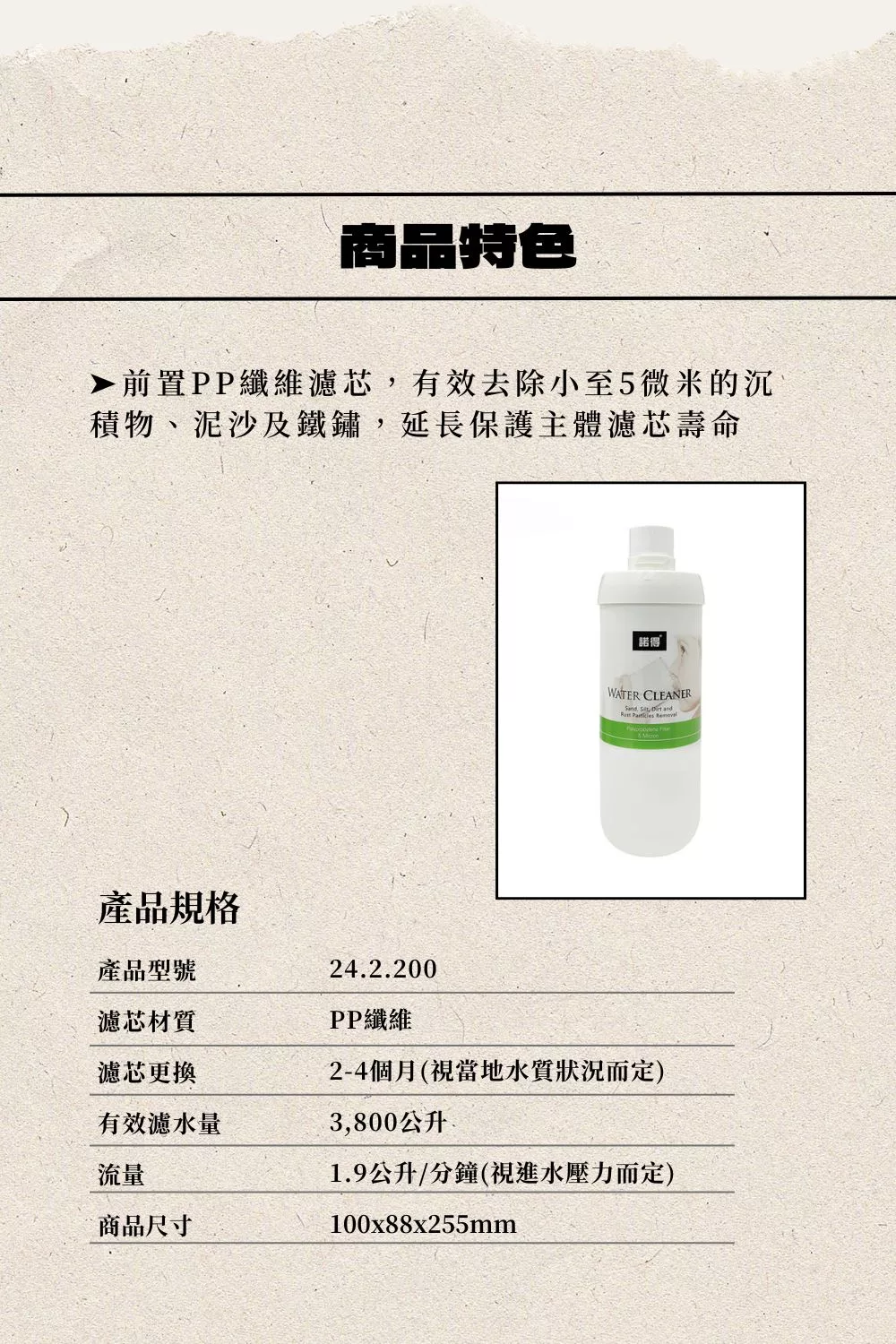 【諾得】PP纖維濾心 24.2.200 (第二代濾頭)NT$450 ➤前置PP纖維濾芯,有效去除小至5微米的沉積物、泥沙及鐵鏽,延長保護主體濾芯壽命 ➤第二代濾頭 【諾得】PP纖維濾心 24.2.200 (第二代濾頭) 數量 加入購物車 貨號: 諾得PP_24.2.200 分類: NEXWATER | 諾得, 各品牌濾心/濾材 標籤: 諾得 描述 相關商品 DC-207-R 食品樹脂濾芯 查看內容 20吋1微米濾芯 查看內容 1500G-RO膜 查看內容 20吋大胖1微米濾芯 查看內容