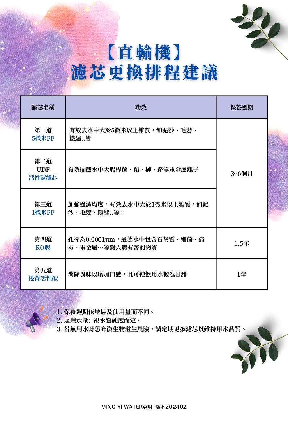 【茗毅】5道式 300G-RO直輸機 / RO純水機 / RO直出機(無桶設計)NT$12,800 台灣製造,通過BSMI認證 無桶設計,節省廚下空間 300G加侖流量 過濾水中石灰質、汙染物質、重金屬、細菌…等 水質乾淨達生飲標準 採用通過NSF濾材 搭配304不鏽鋼無鉛龍頭 尺寸:長37x寬18x高46cm 額定電壓:110V/60Hz 產地:台灣 【茗毅】5道式 300G-RO直輸機 / RO純水機 / RO直出機(無桶設計) 數量 加入購物車 貨號: 300G 直輸機 分類: --RO | 直輸機, 【全屋淨】, 選配飲水淨水設備 標籤: MING YI 描述 相關商品 DC-203-C 活性碳濾芯 查看內容 200噸全戶濾芯 查看內容 【茗毅】全戶型200噸不銹鋼淨水器 PW-200T NT$23,000 加入購物車 10吋活性碳濾芯 CTO NT$300 加入購物車