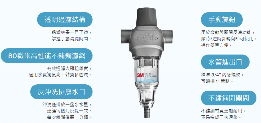 - 獨特反洗設計:非傳統單向水流沖洗,可輪替進行正沖、反洗,徹底清理濾網雜質,透明濾瓶設計讓過濾效果一目了然