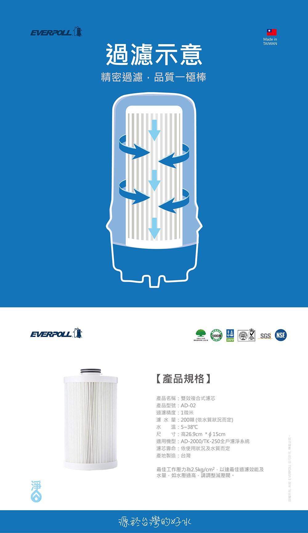 【愛科 EVERPOLL】全戶AD-2000/TK-250專用濾芯(濾芯型號AD-02)NT$4,900 – NT$5,500 額定淨水總量200噸 2合1雙效複合式濾芯 過濾精度1微米 除氯、鉛、重金屬、有機化合物 選項 DIY安裝價到府安裝價請選取一個選項DIY安裝價到府安裝價清除 【愛科 EVERPOLL】全戶AD-2000/TK-250專用濾芯(濾芯型號AD-02) 數量 加入購物車 貨號: AD-02全戶濾芯 分類: EVERPOLL | 愛科, 全戶濾心, 各品牌濾心/濾材 標籤: EVERPOLL 愛科 描述 額外資訊 選項 DIY安裝價, 到府安裝價 相關商品 20吋大胖5微米濾芯 查看內容 10吋5微米濾芯 NT$50 加入購物車 Global Aqua 75G-RO膜 NSF認證 NT$1,500 加入購物車 【愛惠浦 EVERPURE】 H300NXT活性碳濾芯 原廠公司貨 NT$4,590 – NT$5,290 選擇規格 此產品有多種款式。 可在產品頁面選擇選項