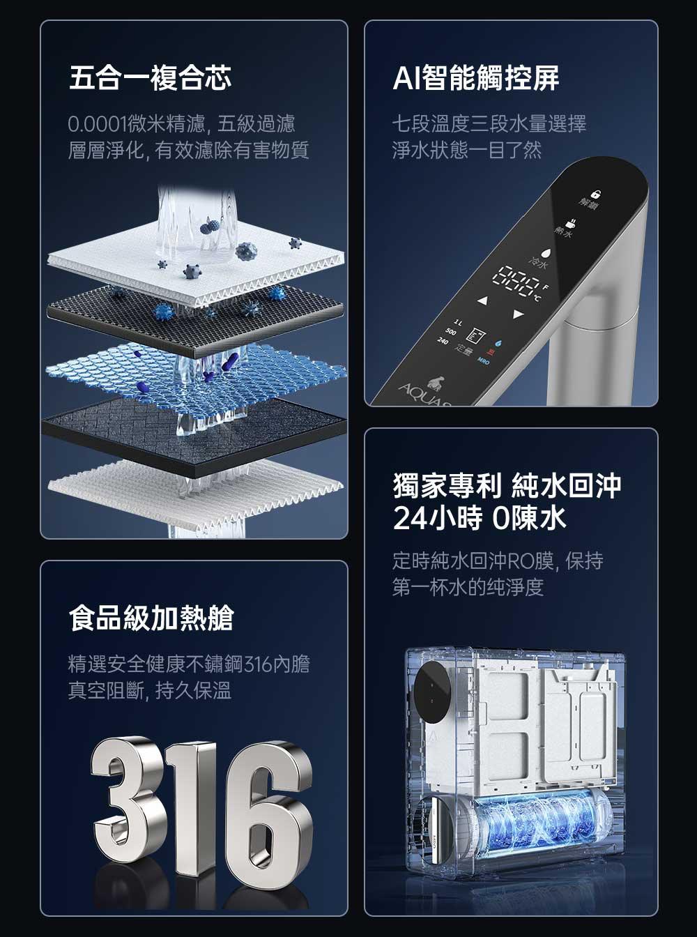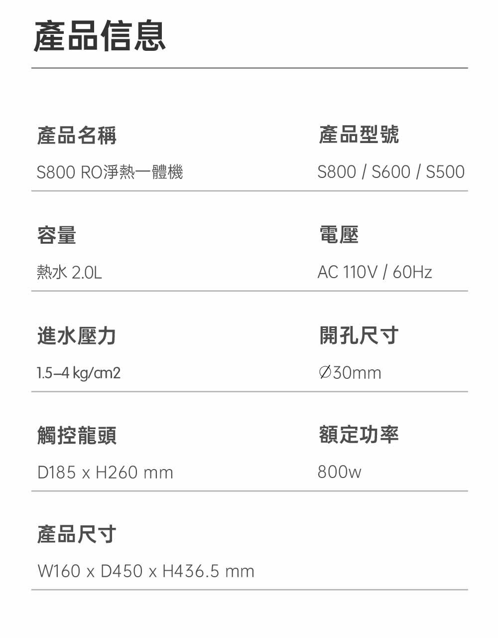 特價 【AQUAS 淨工坊】 S800 RO淨熱一體機(淨熱一體 一級節能 潔淨加熱)NT$48,000 原始價格:NT$48,000。NT$42,750目前價格:NT$42,750。 智慧觸屏、多段控溫、智能水龍頭 三重乾燒防護 一體集成水路0漏水隠患 800G大通量淨化 AI智能觸控:7段溫度三段水量選擇 能源效率:1級能效 龍頭顏色 SUS不鏽鋼髮絲紋SUS不鏽鋼消光黑請選取一個選項SUS不鏽鋼髮絲紋SUS不鏽鋼消光黑清除 【AQUAS 淨工坊】 S800 RO淨熱一體機(淨熱一體 一級節能 潔淨加熱) 數量 加入購物車 貨號: 不提供 分類: AQUAS | 淨工坊 描述 額外資訊 龍頭顏色 SUS不鏽鋼髮絲紋, SUS不鏽鋼消光黑