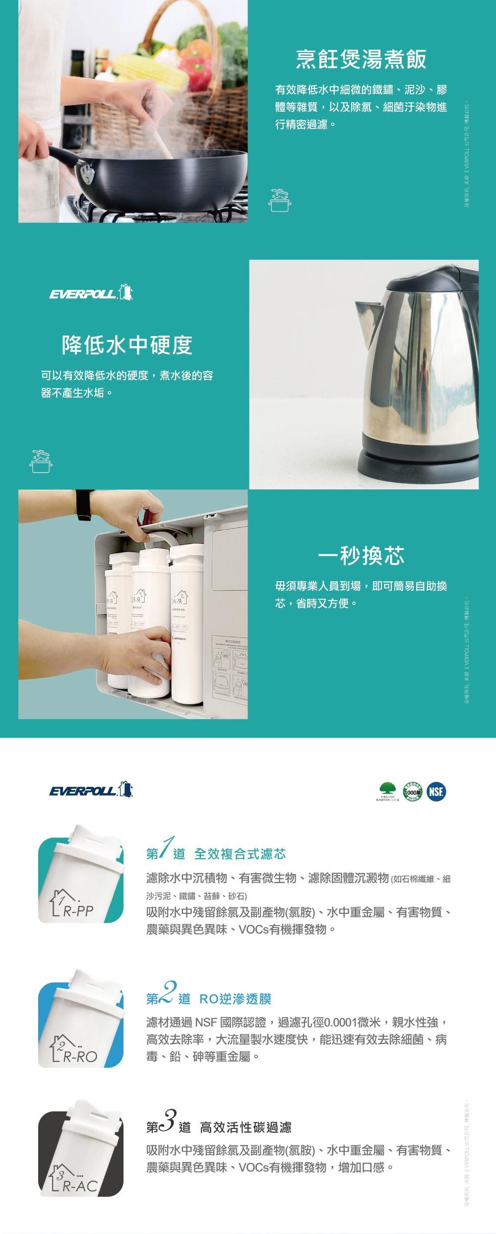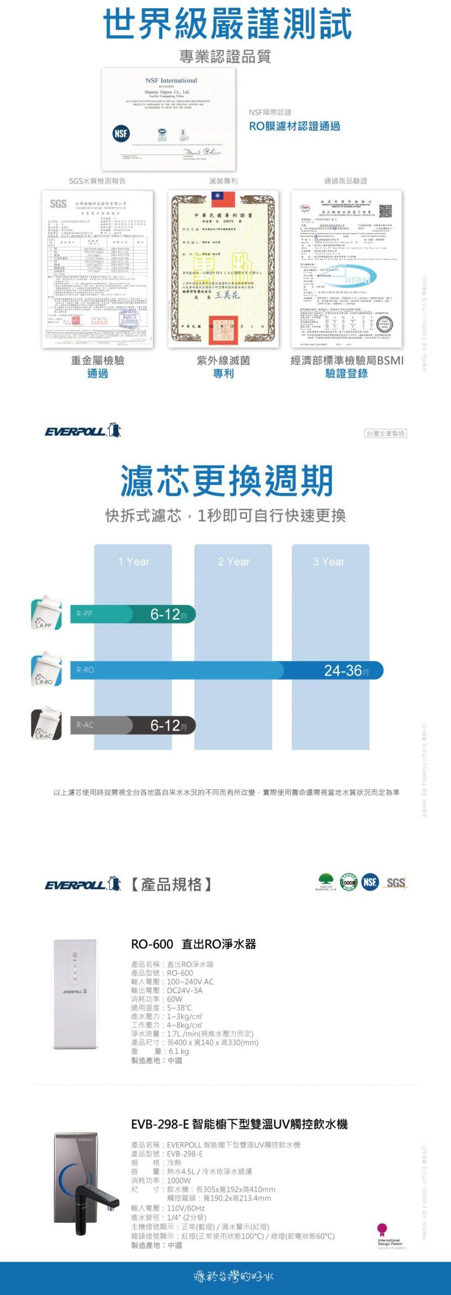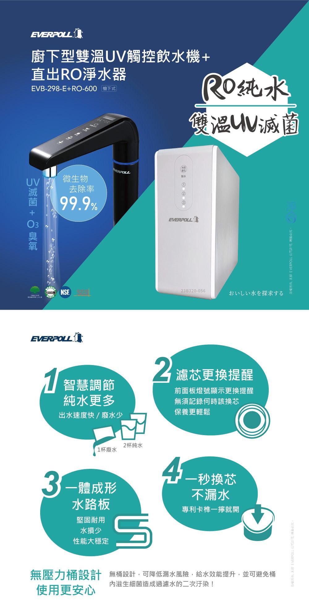 【EVERPOLL 愛科】 EVB-298-E廚下型雙溫UV觸控飲水機 (搭配RO600直出RO淨水器)NT$48,800 【愛科 EVB-298-E 廚下型調溫無壓飲水機 (旋鈕數位式多段龍頭)特色】 熱飲機內建自動補水裝置 啟動加熱完成僅約20分 UV滅菌+O3臭氧雙重保護 附有漏電斷路裝置 【愛科RO600特色】 直出式不需儲水桶 三道簡易式快拆濾心 採用最新奈米RO膜技術 主產品僅包含過濾設備,需加購龍頭 【EVERPOLL 愛科】 EVB-298-E廚下型雙溫UV觸控飲水機 (搭配RO600直出RO淨水器) 數量 加入購物車 貨號: EVERPOLL RO600-1-1 分類: EVERPOLL | 愛科 標籤: EVERPOLL 愛科 描述 額外資訊 選購區 單機, 加購 304不鏽鋼龍頭 相關商品 【EVERPOLL 愛科】傳家寶 全戶淨水系統 FH-301 NT$29,500 加入購物車 【EVERPOLL愛科】MF110多功能商用淨水濾芯 NT$5,250 加入購物車 【愛科 EVERPOLL】全戶AD-2000/TK-250專用濾芯(濾芯型號AD-02) NT$4,900 – NT$5,500 選擇規格 此產品有多種款式。 可在產品頁面選擇選項 【EVERPOLL 愛科】 RO-600/RO600 直出RO淨水器 NT$14,800 – NT$17,300 選擇規格 此產品有多種款式。 可在產品頁面選擇選項
