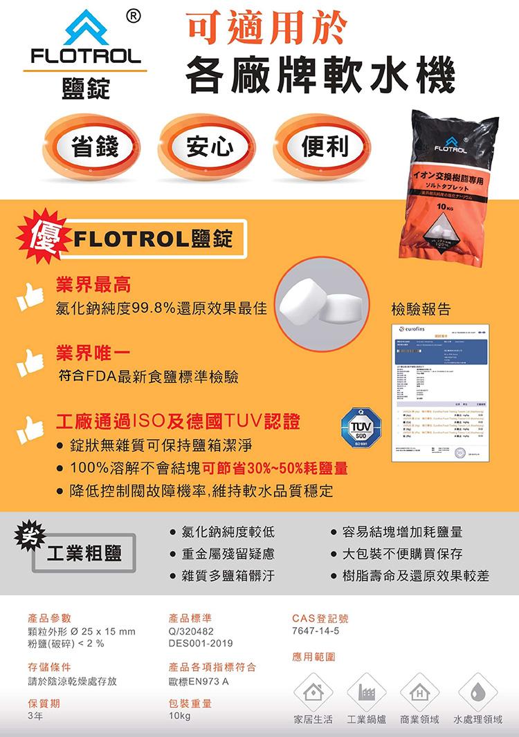 【FLOTROL富洛】軟水鹽錠/鹽碇-樹脂還原用鹽(10KG/包)NT$450 符合FDA最新食鹽標準檢驗 100%溶解不會結塊 可節省30~50%耗鹽量 【FLOTROL富洛】軟水鹽錠/鹽碇-樹脂還原用鹽(10KG/包) 數量 加入購物車 分類: 各品牌濾心/濾材 描述 相關商品 10吋活性碳濾芯 CTO NT$300 加入購物車 【愛惠浦 EVERPURE】 BH2活性碳濾芯 原廠公司貨 NT$4,090 – NT$4,790 選擇規格 此產品有多種款式。 可在產品頁面選擇選項 小T33 椰殼顆粒活性碳濾心 後置活性碳濾心 NT$500 加入購物車 【濱特爾 PENTAIR】MC² / MC2商用濾心 濾芯 美國進口平行輸入 EVERPURE (DIY) NT$2,600 加入購物車
