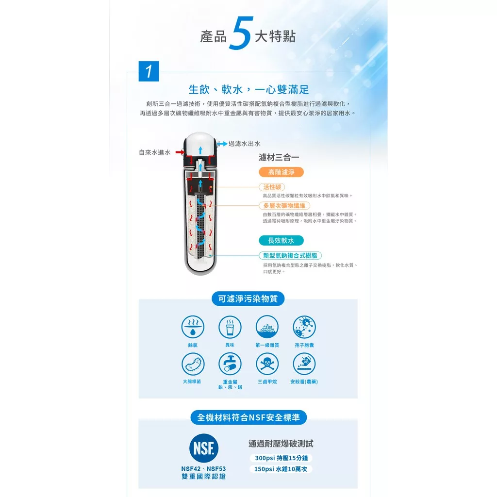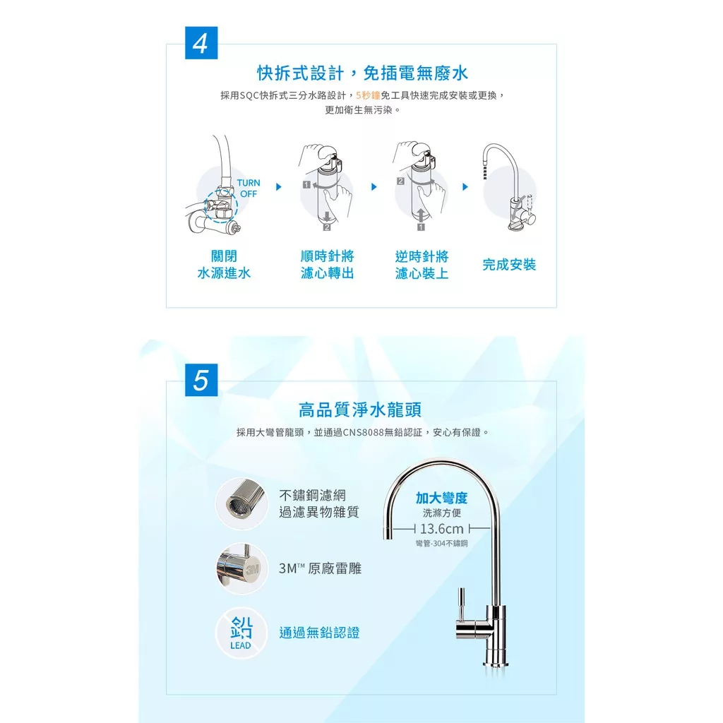 - 採用SQC快拆式三分水路設計,出水量大,方便更換濾心