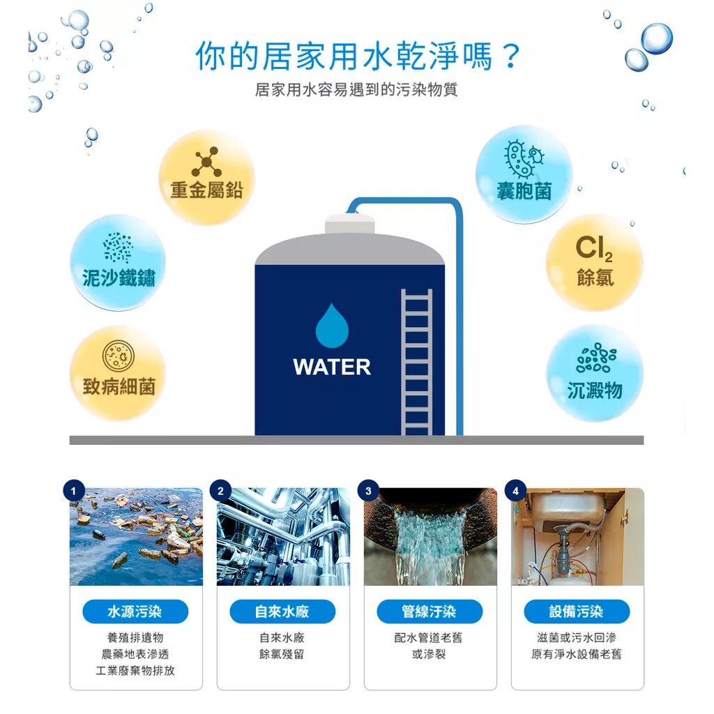 - 經SGS檢驗,可過濾水中部份有機物(如三鹵甲烷)、部分有害重金屬(如鉛、汞)以及大腸桿菌