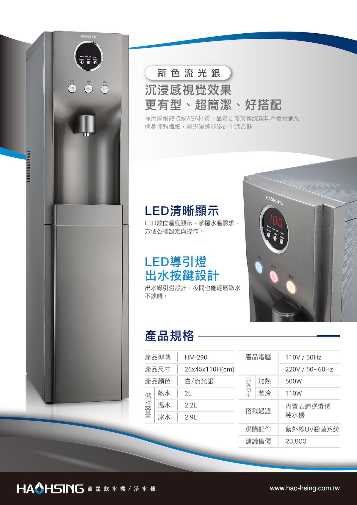 【豪星】HM-290 立地型飲水機NT$23,800 漏水偵測 兒童安全鎖 六段式保溫設定 顏色 白色灰色請選取一個選項白色灰色清除 【豪星】HM-290 立地型飲水機 數量 加入購物車 貨號: HM-290 分類: HAOHSING | 豪星 標籤: 豪星 描述 額外資訊 顏色 白色, 灰色 相關商品 【豪星】HM-190 桌上型RO飲水機 NT$22,800 選擇規格 此產品有多種款式。 可在產品頁面選擇選項 【豪星】HM-900 冰溫熱飲水機 (彩灰/晶亮白) NT$30,800 選擇規格 此產品有多種款式。 可在產品頁面選擇選項 【豪星】HS-600G 廚下直輸RO淨水器 NT$18,800 加入購物車 【豪星】HS-N3 傾喝水 母嬰級廚下三溫飲水機(需加購淨水設備) NT$48,600 加購飲水淨水設備