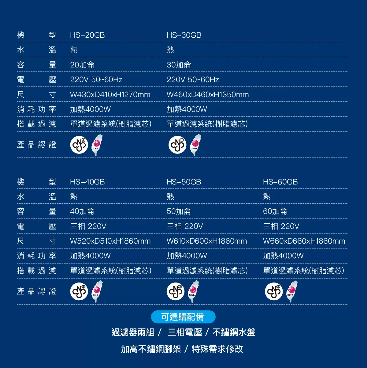【豪星】立地式電開水機 HS-20GB /HS-30GB /HS-40GB /HS-50GB /HS-60GBNT$27,800 – NT$48,800價格範圍:NT$27,800 到 NT$48,800 防空燒保護 CNS漏電斷路器 不鏽鋼安全鎖龍頭 步進式加熱技術 型號 HS-20GBHS-30GBHS-40GBHS-50GBHS-60GB請選取一個選項HS-20GBHS-30GBHS-40GBHS-50GBHS-60GB清除 【豪星】立地式電開水機 HS-20GB /HS-30GB /HS-40GB /HS-50GB /HS-60GB 數量 加入購物車 貨號: 不提供 分類: HAOHSING | 豪星 標籤: 豪星 描述 額外資訊 型號 HS-20GB, HS-30GB, HS-40GB, HS-50GB, HS-60GB 相關商品 【豪星】HM-538廚下型冷熱飲水機(含316L雙溫龍頭)–需另選購淨水器 NT$18,800 加購飲水淨水設備 【豪星】 PYXIS H1 智慧熱交換飲水機 NT$46,800 加入購物車 【豪星】HS-M2 廚下型溫熱飲水機UV(需加購淨水設備) NT$29,800 加購飲水淨水設備 【豪星】HM-290 立地型飲水機 NT$23,800 選擇規格 此產品有多種款式。 可在產品頁面選擇選項