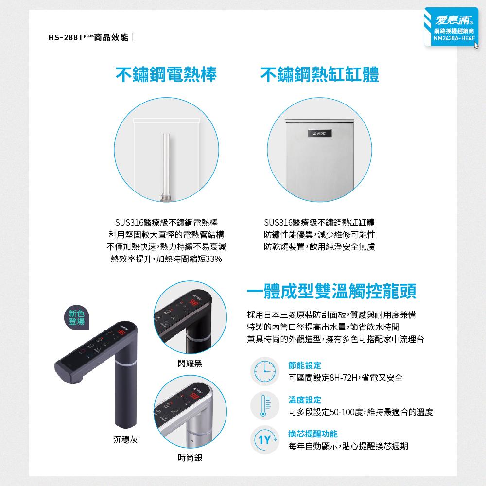 特價 【愛惠浦 EVERPURE】HS288T PLUS+PURVIVE-觸控雙溫生飲級單道式廚下型淨水器(搭配方案 4H2/RO逆滲透)NT$29,990 免費到府標準安裝 可設定多段熱水溫度及換芯提醒 可濾除鉛、銅、鎘、汞等重金屬 *實際價格與愛惠浦官網同步 過濾器 愛惠浦4H275G-RO逆滲透請選取一個選項愛惠浦4H275G-RO逆滲透清除 【愛惠浦 EVERPURE】HS288T PLUS+PURVIVE-觸控雙溫生飲級單道式廚下型淨水器(搭配方案 4H2/RO逆滲透) 數量 加入購物車 貨號: HS288Tplus 分類: --愛惠浦淨水設備, EVERPURE | 愛惠浦 標籤: 愛惠浦 EVERPURE 描述 額外資訊 過濾器 愛惠浦4H2, 75G-RO逆滲透 相關商品 【愛惠浦 EVERPURE】PurVive-EF6000 生飲級單道式廚下型淨水器(可加購升級套件) NT$13,090 – NT$17,340 選擇規格 此產品有多種款式。 可在產品頁面選擇選項 【濱特爾 PENTAIR】BH2濾心 濾芯 美國進口平行輸入 EVERPURE (DIY) NT$2,800 加入購物車 【濱特爾 PENTAIR】QL3-MC2商用淨水設備 (可加購升級設備) EVERPURE NT$6,500 加入購物車 【濱特爾 PENTAIR】4HL濾心 濾芯 美國進口平行輸入 EVERPURE (DIY) NT$2,500 加入購物車