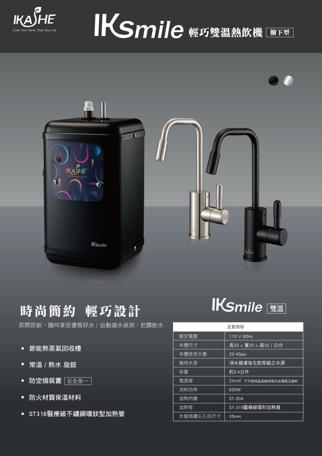 【IKASHE 愛蔻淨】IK-Smile 輕巧雙溫熱飲機NT$18,800 – NT$21,000 節能熱蒸氣回收槽 常溫 / 熱水 旋鈕 防空燒裝置,安全第一 防火材質保溫材料 ST316醫療級不鏽鋼環狀型加熱管 自動漏水偵測,把關飲水 即開即飲,隨時享受優質好水 過濾設備 請選取一個選項五道式75G-RO逆滲透宮黛三道愛惠浦4HL單機(加熱器)清除 【IKASHE 愛蔻淨】IK-Smile 輕巧雙溫熱飲機 數量 加入購物車 貨號: 不提供 分類: GUNG DAI | 宮黛, IKASHE | 愛蔻淨 描述 額外資訊 過濾設備 五道式75G-RO逆滲透, 宮黛三道, 愛惠浦4HL, 單機(加熱器) 相關商品 【宮黛】GD SOLO全智慧美學落地型飲水機 (冰/溫/熱) NT$35,800 加入購物車 【宮黛】GD SODA全功能智慧氣泡水飲水機 (三溫/氣泡水/四機一體)—搭配宮黛GD IZERO II 直輸機 (全機台灣製造) NT$60,800 加入購物車 【宮黛】GD800櫥下觸控式(冰溫熱)飲水機—搭配宮黛GD IZERO II 直輸機 (全機台灣製造) NT$44,800 加入購物車 特價 【豪華淨水組合】宮黛GD600+全戶軟水PW-250+全戶淨水PW-200T NT$111,600 原始價格:NT$111,600。NT$79,800目前價格:NT$79,800。 加入購物車