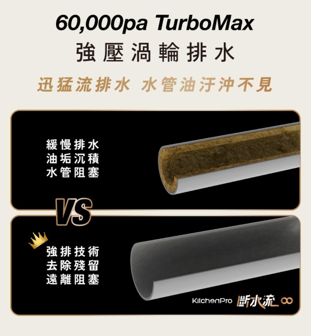 採用 TurboMax 60,000 Pa 渦輪排水搭配 8 道研磨工序,能迅速處理廚餘並沖洗乾淨,保持下水管道暢通。 -