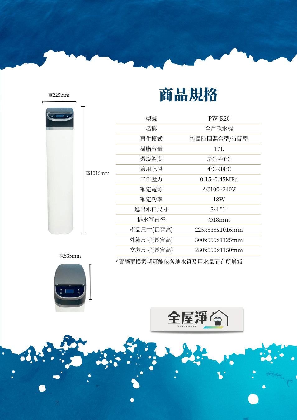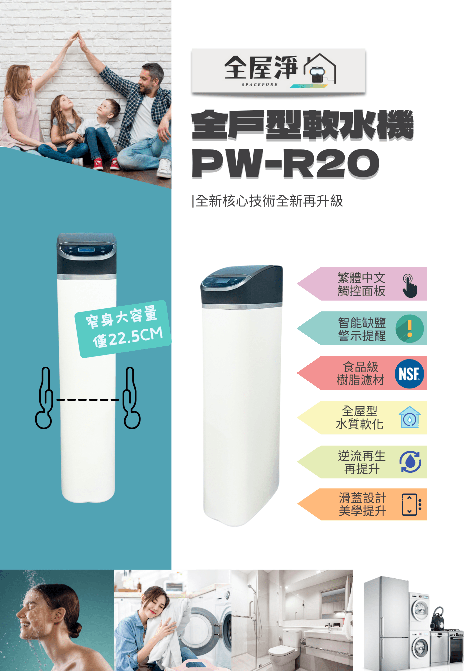 【全屋淨】全戶軟水機 PW-R20NT$49,800 -窄身設計僅22.5cm 大樓安裝也可以 -繁體中文觸控面板 -智能缺鹽警示提醒 -食品級樹脂濾材 -全屋型水質軟化 -逆流再生再提升 -滑蓋設計美學提升 PW-R20軟水機-產品說明書 【全屋淨】全戶軟水機 PW-R20 數量 加入購物車 貨號: PW-R20 分類: --全戶軟水設備, 【全屋淨】 標籤: 全戶淨水, 全戶軟水, 淨水, 軟水 描述 相關商品 【全屋淨】10吋反洗式過濾器 PW-VA10M 系列 NT$13,800 – NT$14,800 選擇規格 此產品有多種款式。 可在產品頁面選擇選項 【茗毅】五道式 75G-RO逆滲透純水機 NT$7,500 加入購物車 【全屋淨】全戶型淨軟一體 PW-SF-T12 (全戶過濾&軟水二合一) NT$63,000 加入購物車 特價 【全屋淨】SF-UD2-21L 潛曜系列-高效型全戶智慧軟淨一體機 (軟水+淨水一機雙效) | 全台服務 NT$69,800 原始價格:NT$69,800。NT$59,800目前價格:NT$59,800。 加入購物車