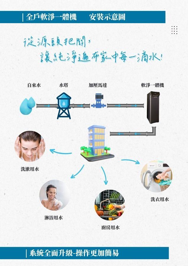 軟水讓洗澡、洗衣、清潔更舒服;淨水讓每一滴進入家中的水都更安全、潔淨、無雜味除餘氯。