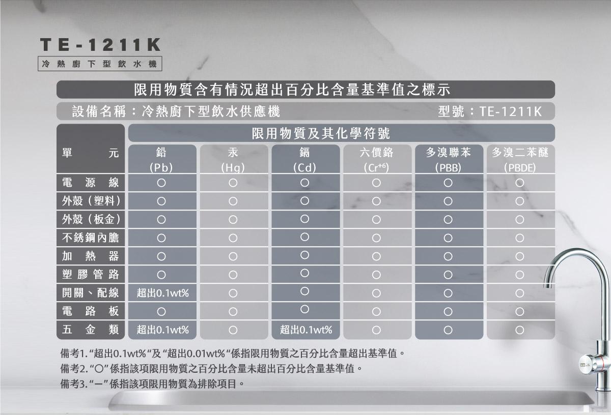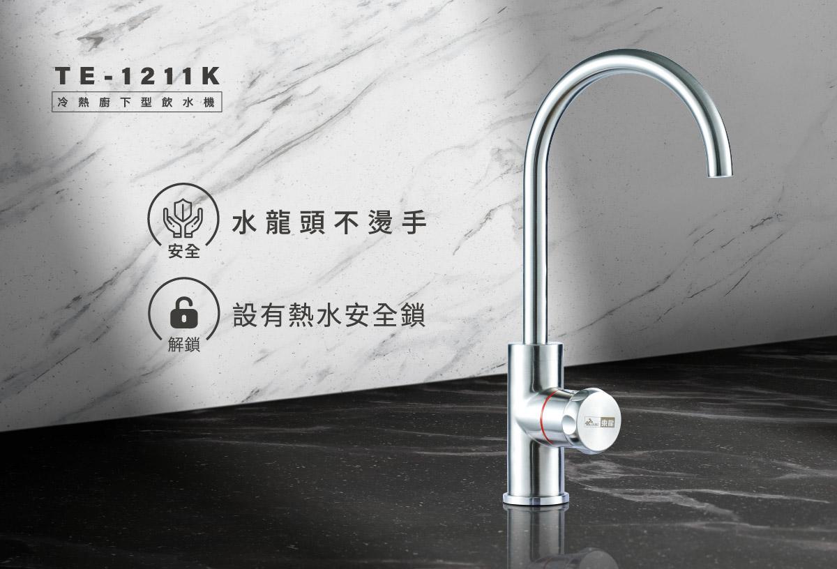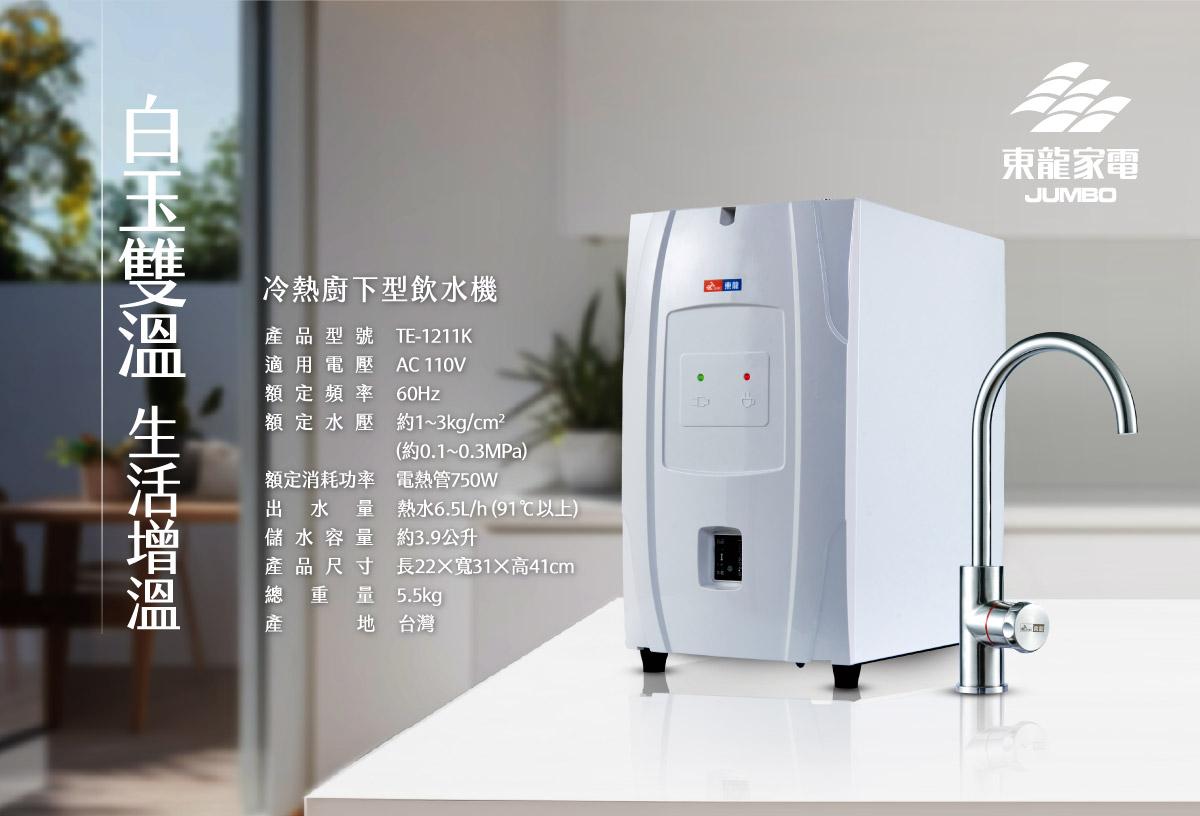 【JUMBO 東龍】TE-1211K冷熱廚下型飲水機NT$19,800 – NT$29,800 業界少見高規多重安全設計 √保溫材質採美國UL防火規定標準 √採用本過熱保護開關 √使用PANASONIC漏電安全斷路器 √使用日本WAKO熱控 √熱水水龍頭設有安全開關 多種過濾方案可供選擇 搭配過濾設備 單機五道75G-RO純水機300G-RO直輸機請選取一個選項單機五道75G-RO純水機300G-RO直輸機清除 【JUMBO 東龍】TE-1211K冷熱廚下型飲水機 數量 加入購物車 貨號: TE-1211K 分類: JUMBO | 東龍 標籤: 東龍 描述 額外資訊 搭配過濾設備 單機, 五道75G-RO純水機, 300G-RO直輸機 相關商品 【JUMBO 東龍】冷熱桌上型飲水機TE-520 (需加購過濾設備) NT$15,500 – NT$25,500 選擇規格 此產品有多種款式。 可在產品頁面選擇選項 【JUMBO 東龍】TE-1212EK 智能觸控式冷熱廚下型飲水機 NT$32,900 – NT$42,900 選擇規格 此產品有多種款式。 可在產品頁面選擇選項 特價 【東龍】全開水溫熱開飲機(TE-1161) NT$3,400 原始價格:NT$3,400。NT$3,000目前價格:NT$3,000。 加入購物車 【JUMBO 東龍】TE-521i 6L冰溫熱逆滲透淨飲機 (瞬熱飲水機) NT$13,800 加入購物車