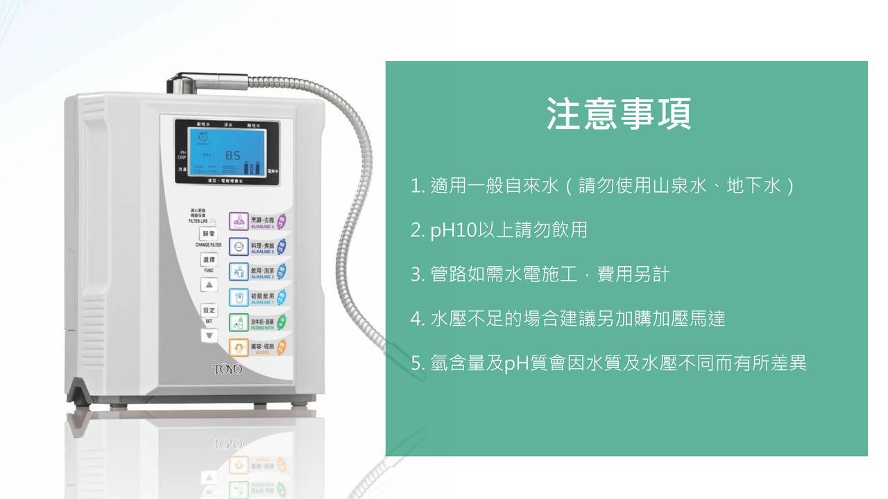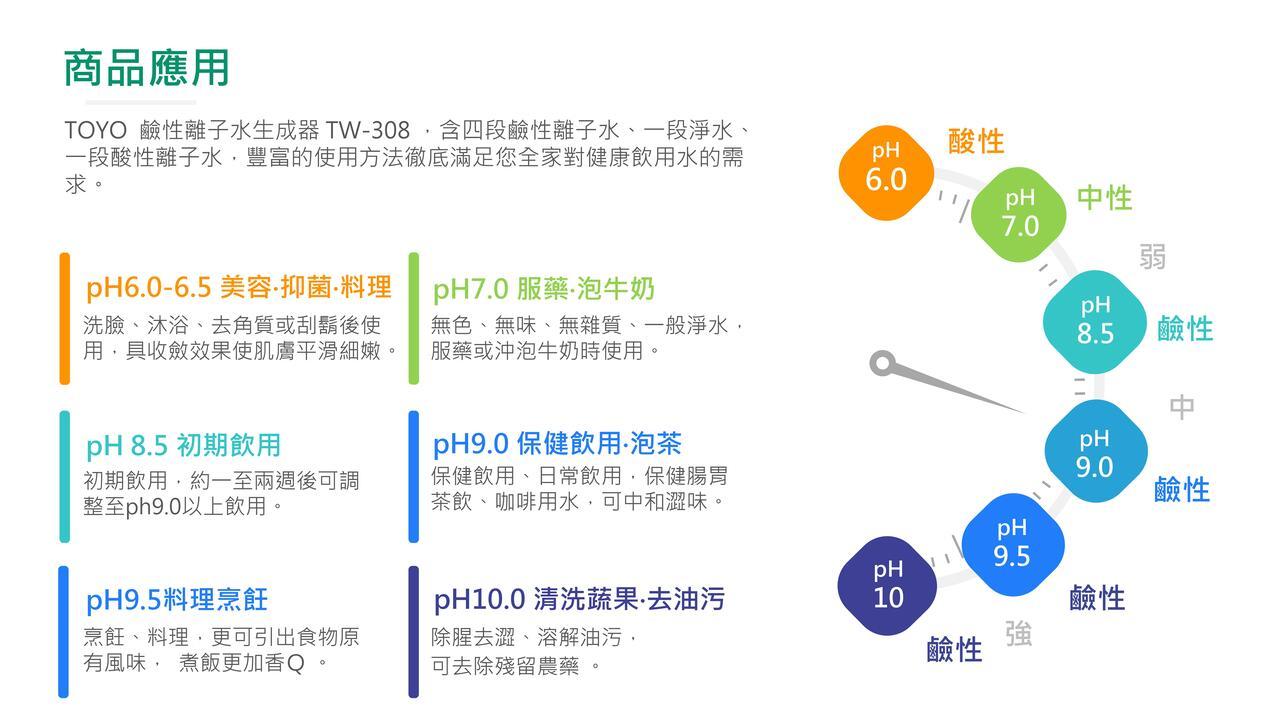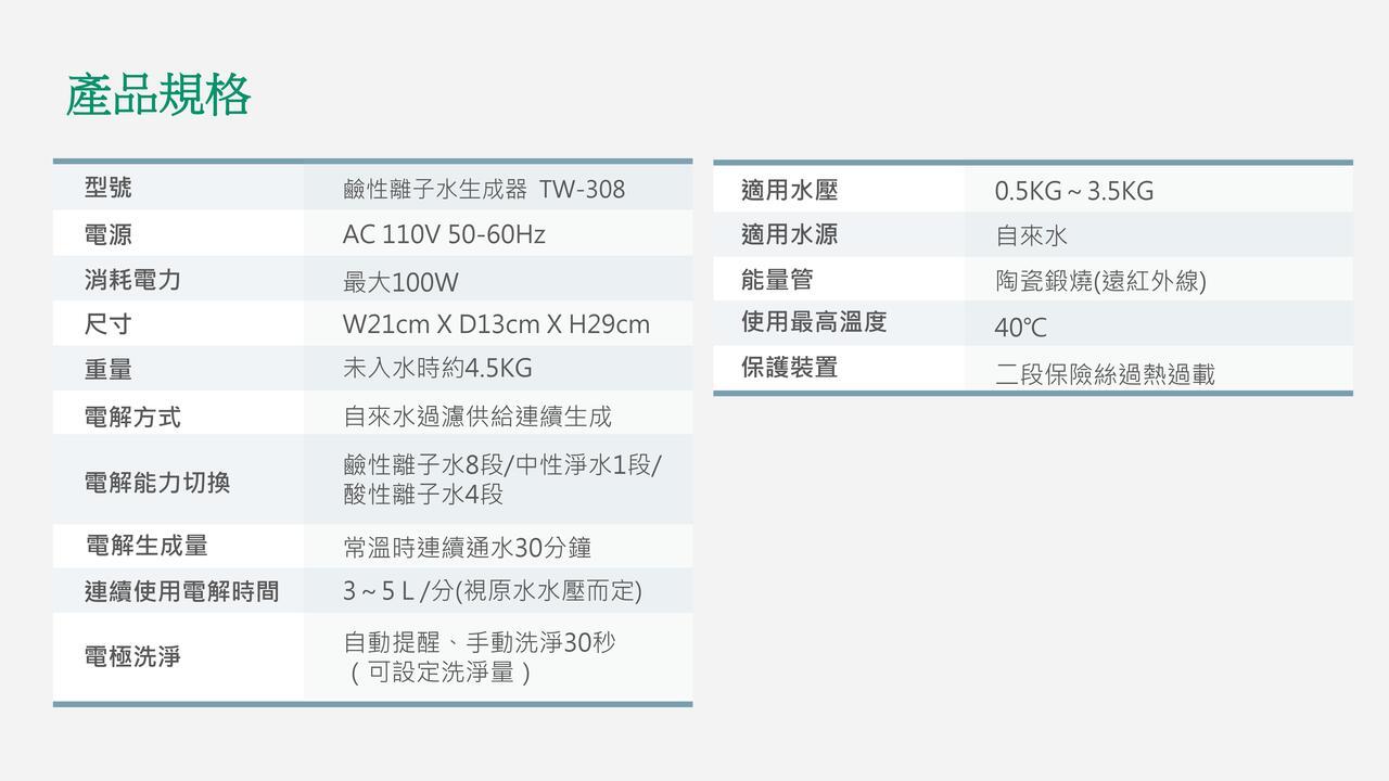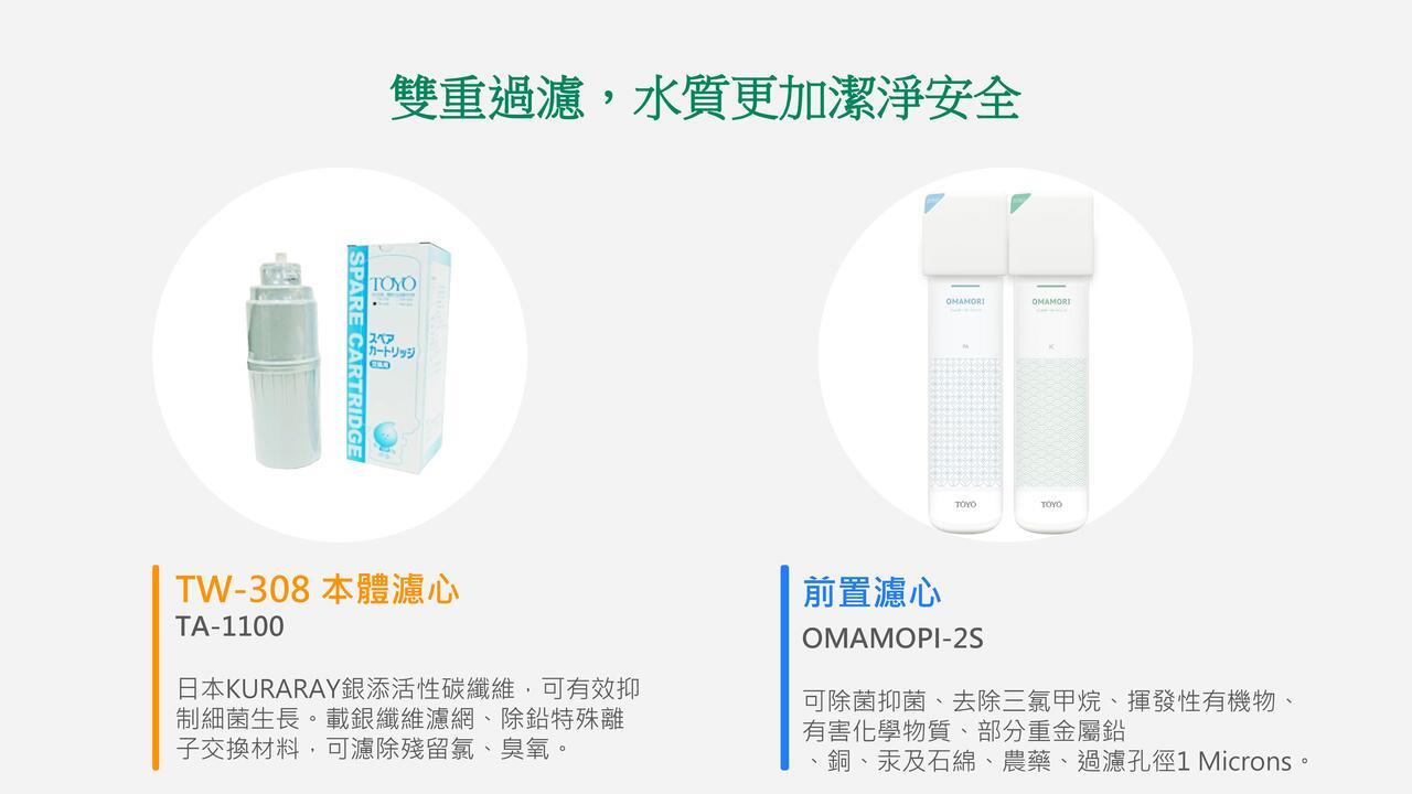 【TOYO】桌上型鹼性離子水生成器 TW-308NT$26,800 日本家庭保健 NO.1 鹼性離子水生成器 可切換 7 段酸鹼值,適合全家人的飲水習慣 濾心智慧提醒更換,安全又貼心 大型液晶表示搭載 【TOYO】桌上型鹼性離子水生成器 TW-308 數量 加入購物車 分類: TOYO | 東洋歐帝 描述 相關商品 特價 【TOYO】H plus觸控廚下型-鹼性離子水雙溫飲水機 H-8 NT$64,500 原始價格:NT$64,500。NT$55,000目前價格:NT$55,000。 加入購物車 【TOYO】桌上型鹼性離子水生成器 TW-508 NT$39,800 加入購物車 【TOYO】SPACO 觸控櫥下型-氣泡水冰溫熱飲水機 X-3 Pro (冰/溫/熱/氣泡水) NT$68,800 選擇規格 此產品有多種款式。 可在產品頁面選擇選項 特價 【TOYO】H plus觸控廚下型-鹼性離子水飲水機 H-5 NT$46,500 原始價格:NT$46,500。NT$39,800目前價格:NT$39,800。 加入購物車