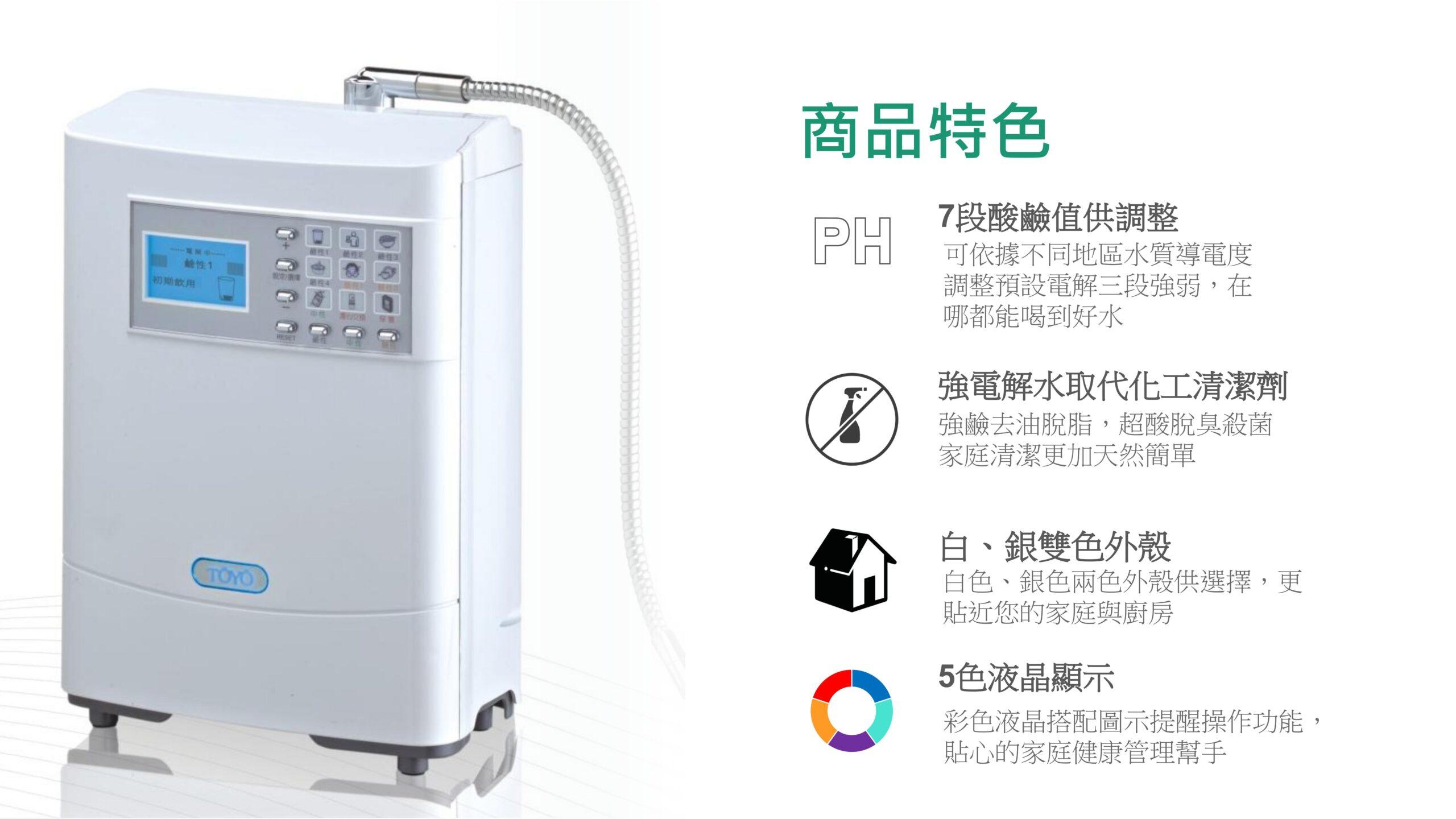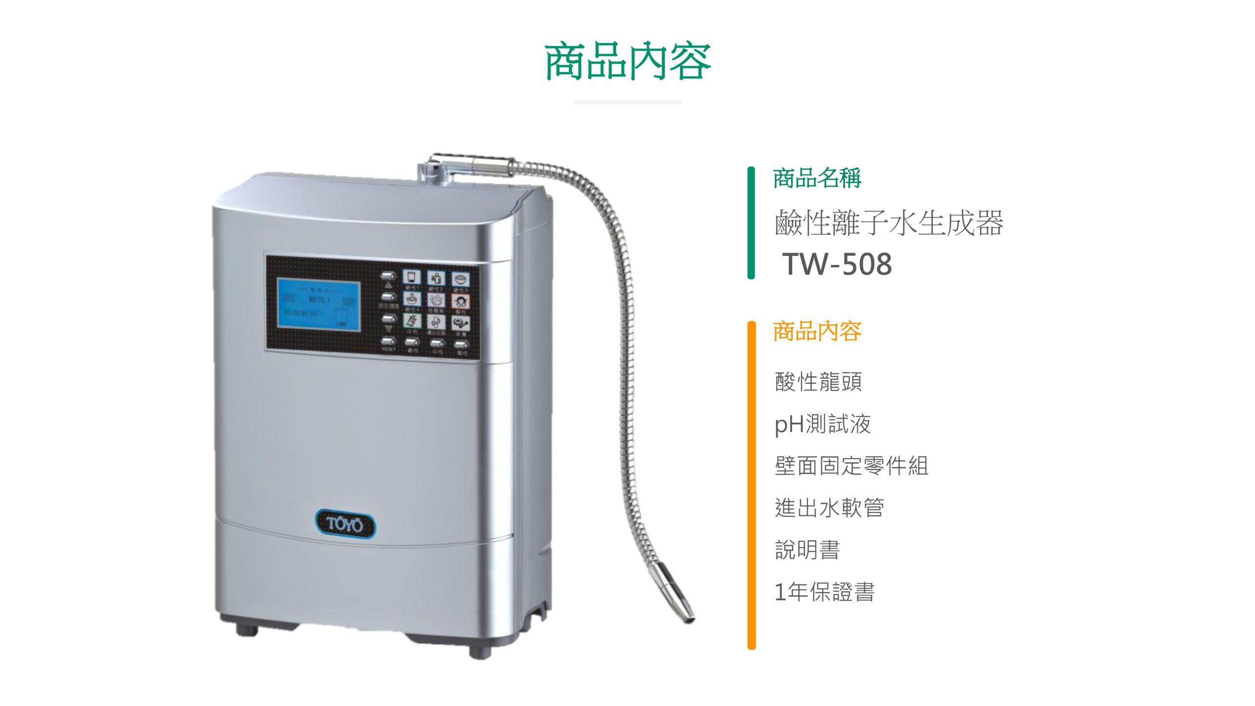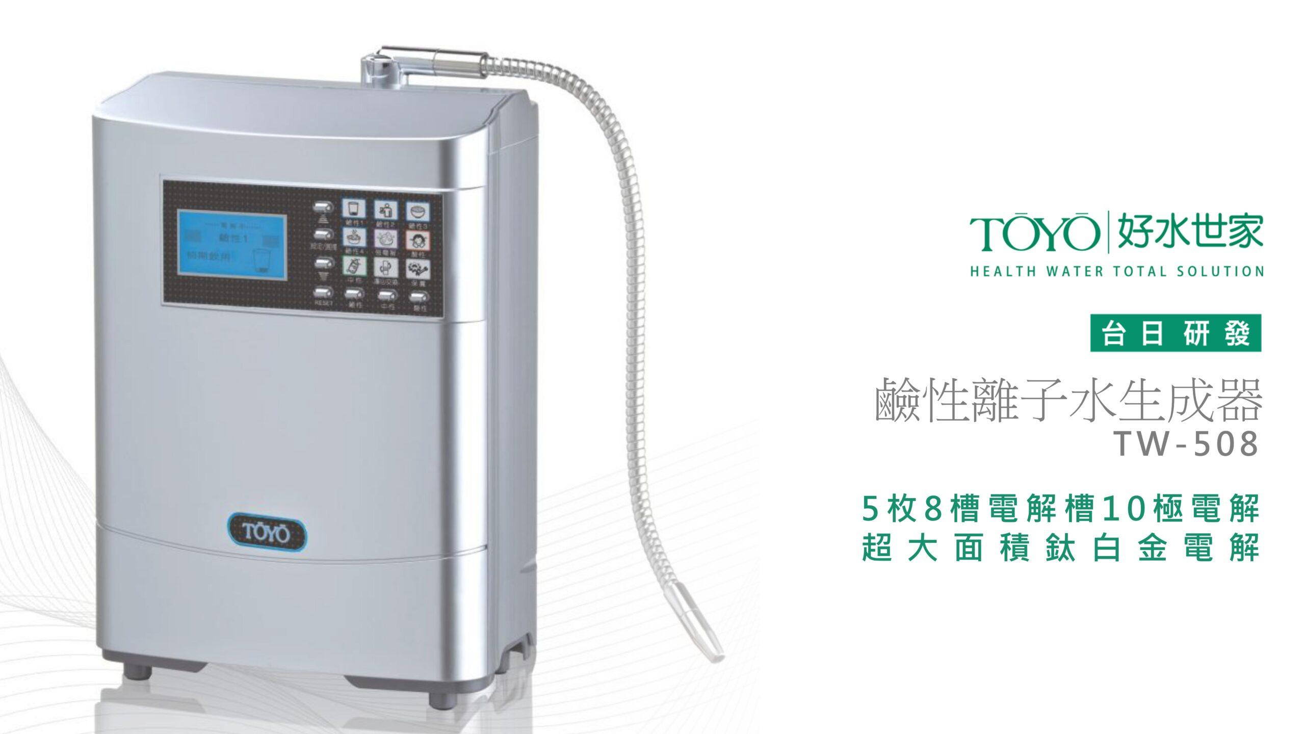 【TOYO】桌上型鹼性離子水生成器 TW-508NT$39,800 日本家庭保健 NO.1 鹼性離子水生成器 可切換 7 段酸鹼值,適合全家人的飲水習慣 濾心智慧提醒更換,安全又貼心 彩色液晶搭配圖示提醒操作功能 加購加鹽濾心,即可製作電解式次氯酸除菌水 【TOYO】桌上型鹼性離子水生成器 TW-508 數量 加入購物車 分類: TOYO | 東洋歐帝 描述 相關商品 特價 【TOYO】H plus觸控廚下型-鹼性離子水飲水機 H-5 NT$46,500 原始價格:NT$46,500。NT$39,800目前價格:NT$39,800。 加入購物車 【TOYO】桌上型鹼性離子水生成器 TW-308 NT$26,800 加入購物車 特價 【TOYO】H plus觸控廚下型-鹼性離子水雙溫飲水機 H-8 NT$64,500 原始價格:NT$64,500。NT$55,000目前價格:NT$55,000。 加入購物車 【TOYO】SPACO 觸控櫥下型-氣泡水冰溫熱飲水機 X-3 Pro (冰/溫/熱/氣泡水) NT$68,800 選擇規格 此產品有多種款式。 可在產品頁面選擇選項