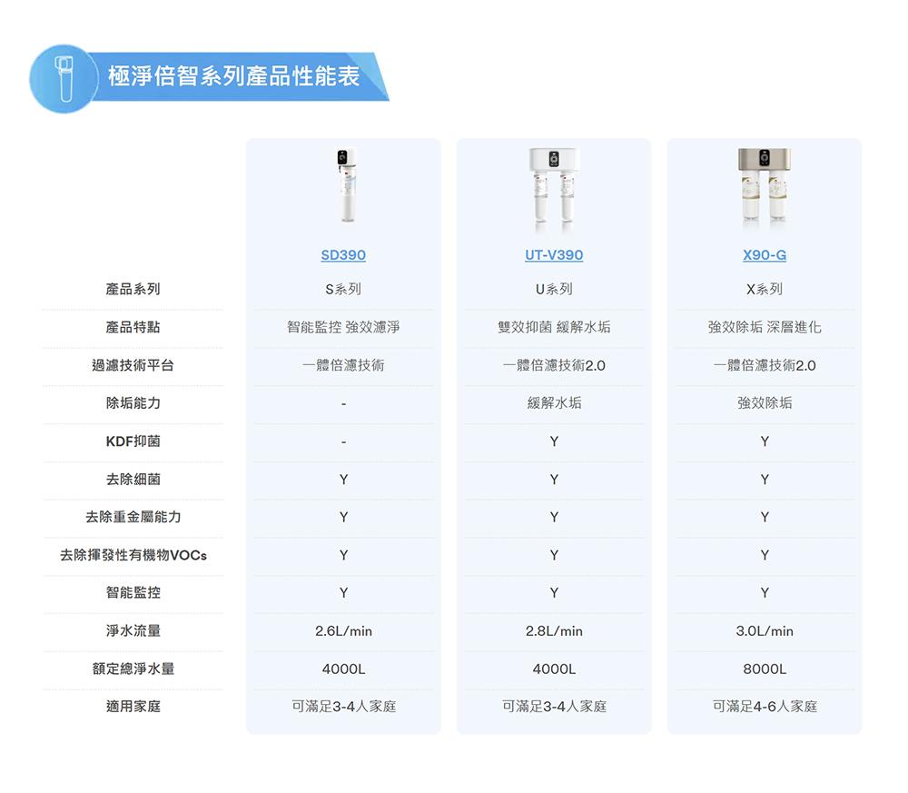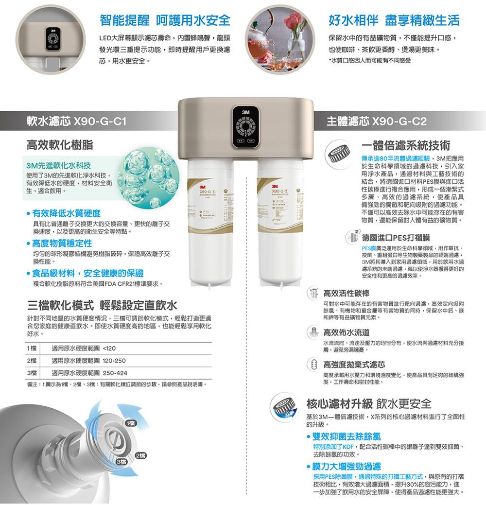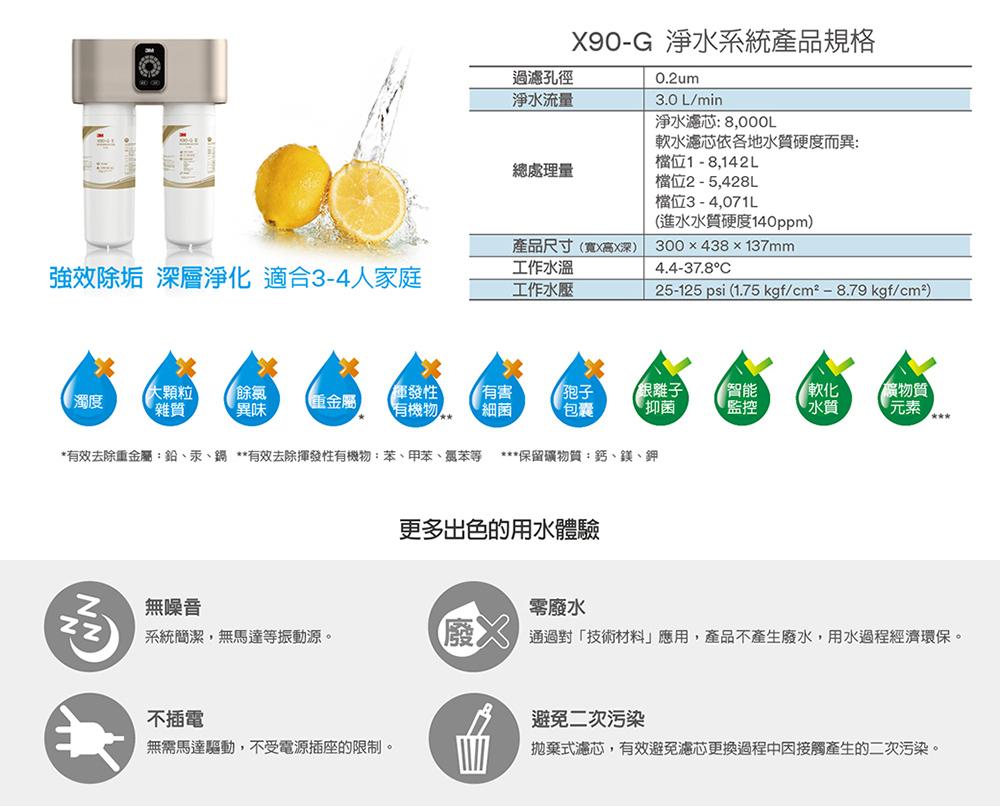 【3M】X90-G極淨倍智雙效淨水系統NT$25,800 有效降低水質硬度 具有比普通離子交換更大的交換容量、更快的離子交換速度,以及更高的衛生安全等特點。 高度物質穩定性 均勻的球形凝膠結構避免樹脂破碎,保證高效離子交換性能。 食品級材料,安全健康的保證 複合軟化樹脂原料符合美國FDA CFR21標準要求。 雙效抑菌去除餘氯 特別添加了KDF,配合活性碳棒中的銀離子達到雙效抑菌、去除餘氯的功效。 膜力大增強勁過濾 採用PES除菌膜,通過特殊的打褶工藝方式,與原有的打褶技術相比,有效增大過濾面積,提升30%的容污能力,進一步加強了飲用水的安全屏障,使得產品過濾性能更強大。 【3M】X90-G極淨倍智雙效淨水系統 數量 加入購物車 貨號: X90-G淨水器 分類: 3M 標籤: 3M 描述 相關商品 【豪星】HS-M3 廚下型冰溫熱飲水機UV(搭配 HS-800G 廚下直輸RO機) NT$59,600 選擇規格 此產品有多種款式。 可在產品頁面選擇選項 【3M】HEAT3000 櫥下型觸控式熱飲機 NT$33,900 – NT$38,900價格範圍:NT$33,900 到 NT$38,900 選擇規格 此產品有多種款式。 可在產品頁面選擇選項 【豪星】HS-M2廚下型溫熱飲水機UV(搭配 HS-800G 廚下直輸RO機) NT$52,600 選擇規格 此產品有多種款式。 可在產品頁面選擇選項 特價 【3M】S004極淨高水量型淨水器 NT$8,780 原始價格:NT$8,780。NT$7,190目前價格:NT$7,190。 加入購物車